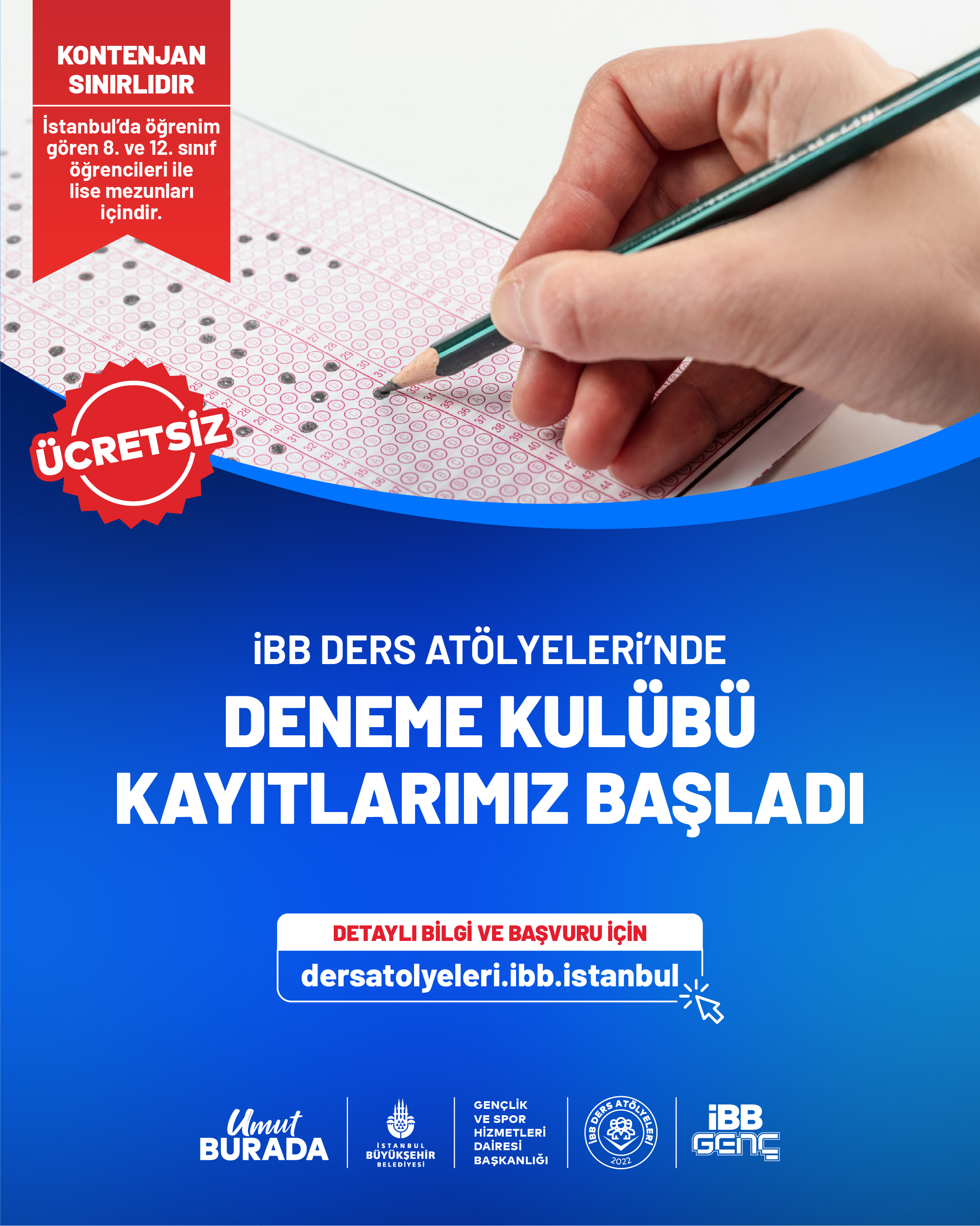 Proje kapsamında TYT, AYT ve LGS denemeleri yapılacaktır. Mart–Haziran dönemi için başvurular İBB Forms üzerinden alınacak, kontenjan dâhilinde kabul edilen adaylara SMS ile bilgilendirme yapılacaktır.